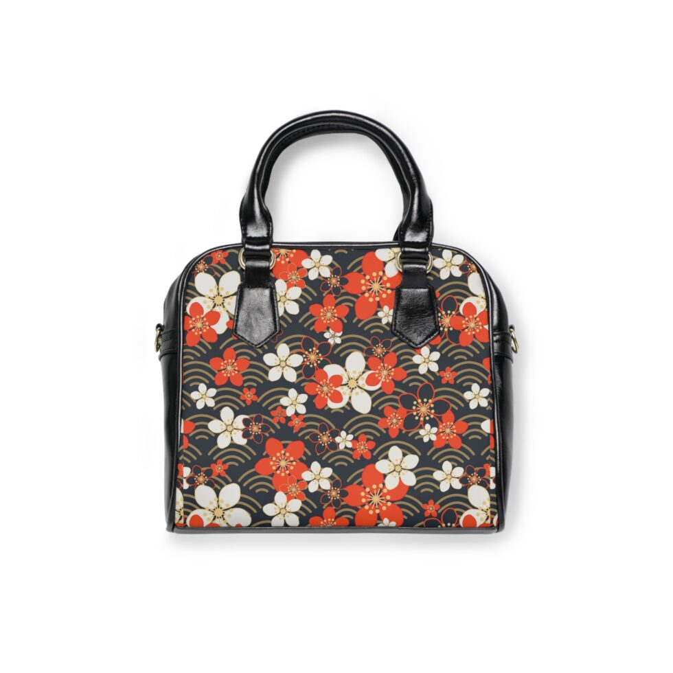 A structured, vintage-inspired shoulder handbag that brings a touch of refined Japanese floral art to everyday carry. The bold red and cream blossoms float across a deep black background with subtle wave motifs, creating a graceful contrast that complements both casual and dressed-up looks. Smooth high-grade PU leather and polished black handles give the bag a luxe feel, while a removable, adjustable shoulder strap adds versatility—carry it by hand for a composed silhouette or sling it over the shoulder for hands-free ease. Inside, a zippered pocket and two open pockets keep essentials organized, and a polyester lining protects the interior. The double-sided print ensures the pattern reads beautifully from every angle, making this bag a wearable statement for those who appreciate artful details and practical design.