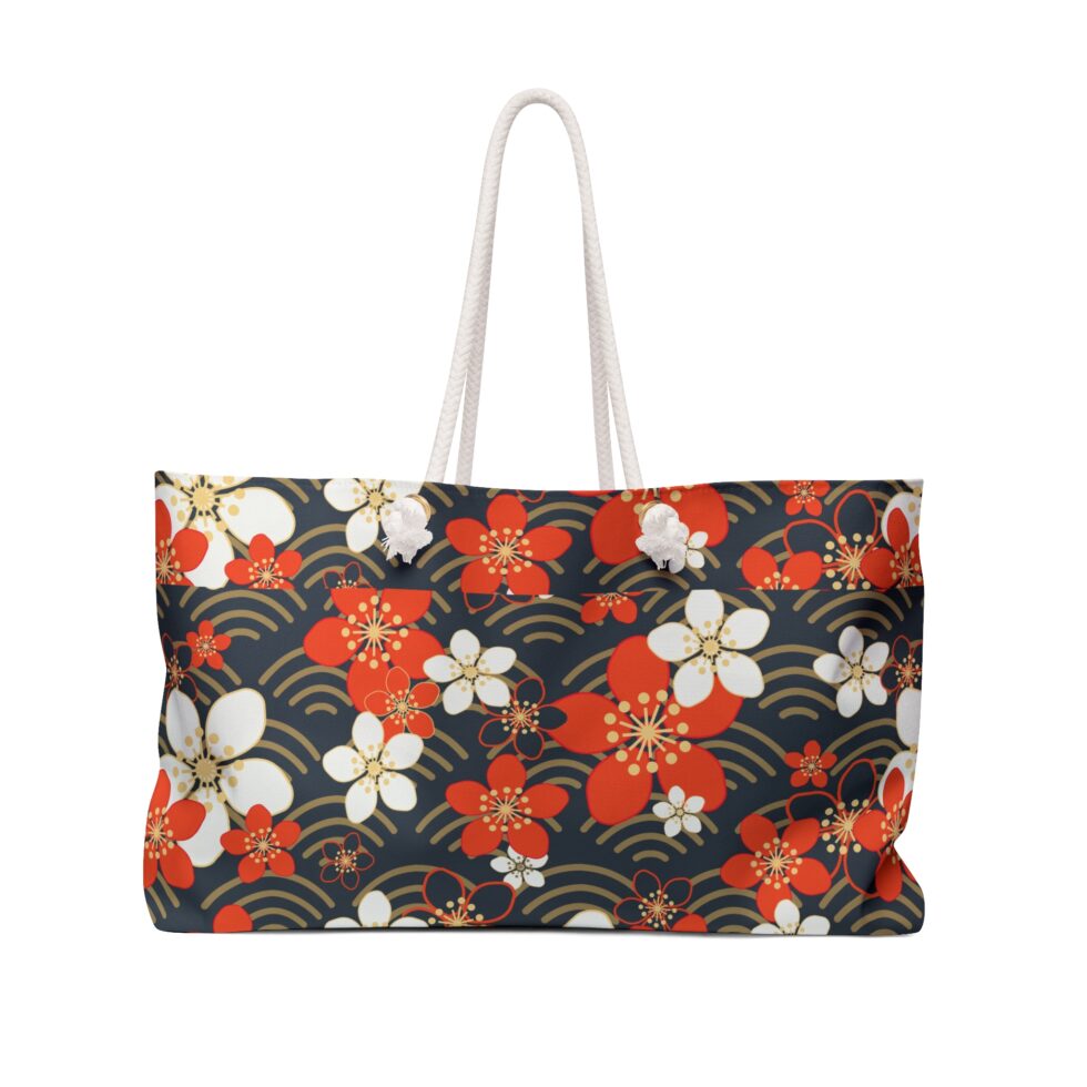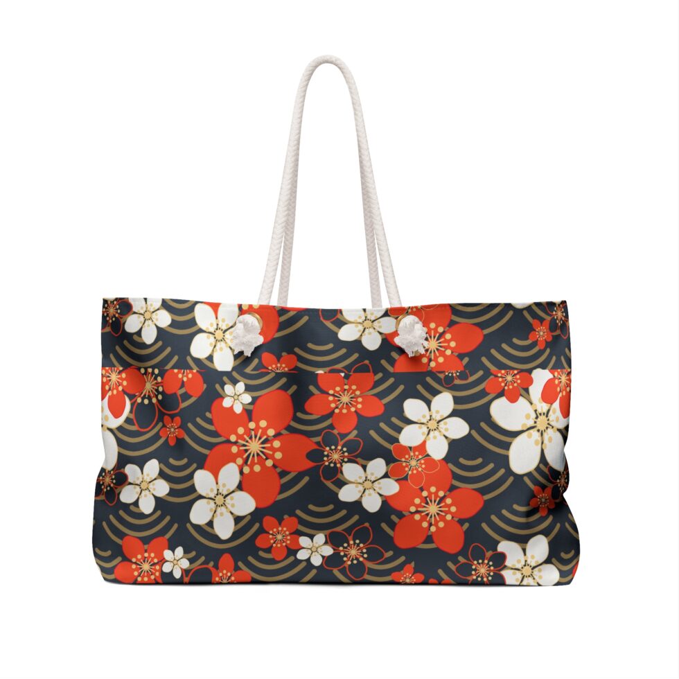Carry a slice of dusk-lit gardens with you. This roomy weekender captures a timeless floral pattern—crimson and ivory blossoms drifting over soft, gold-arched waves—so every outing feels curated and calm. The wide, T-bottom silhouette holds a weekend’s worth of plans: a picnic blanket, a camera, armfuls of souvenirs, or the layers you’ll need when the temperature shifts. Thick cotton rope handles sit comfortably on the shoulder and thread through warm gold grommets, while the cream-lined interior protects delicate finds. Light-resistant spun polyester keeps the print vivid and resists wrinkling, so the bag looks composed straight from the car to the café. Built with practical proportions and quiet, handcrafted details, this bag settles into the life of someone who values thoughtful style and easy organization for weekend escapes and everyday crossings.