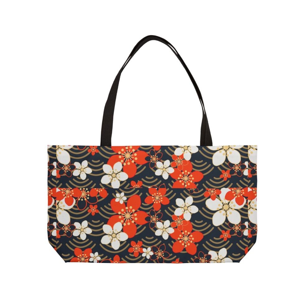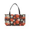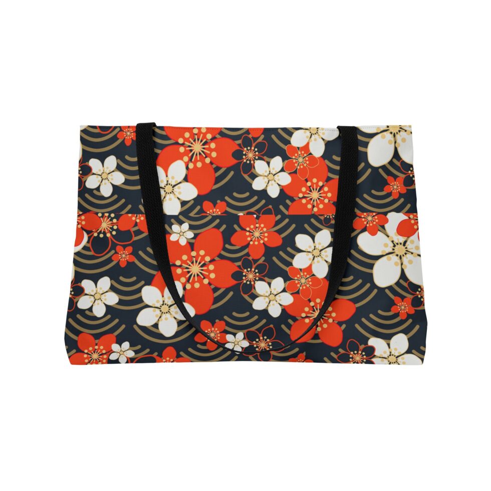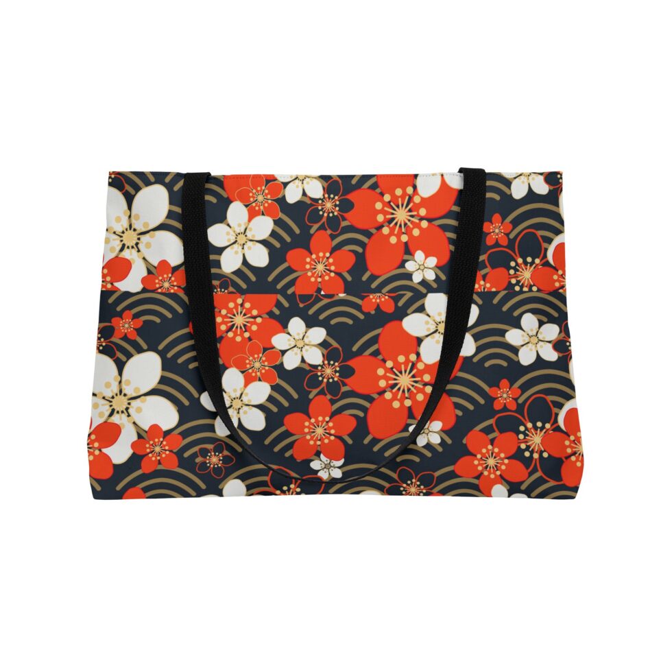 Carry a little pocket of evening garden with you. This roomy weekender tote blends bold crimson and soft cream blossoms with dark, waving lines that suggest lantern-lit water at dusk. It’s lightweight but structured — a travel companion that slips easily into weekend rhythms: farmers’ markets, train rides, or a quiet picnic by the river. The black handles and interior give the design a grounded, modern edge while the all-over print keeps the floral motif uninterrupted from side to side. Bring a touch of calm energy and hand-crafted flair to everyday outings or laid-back getaways.